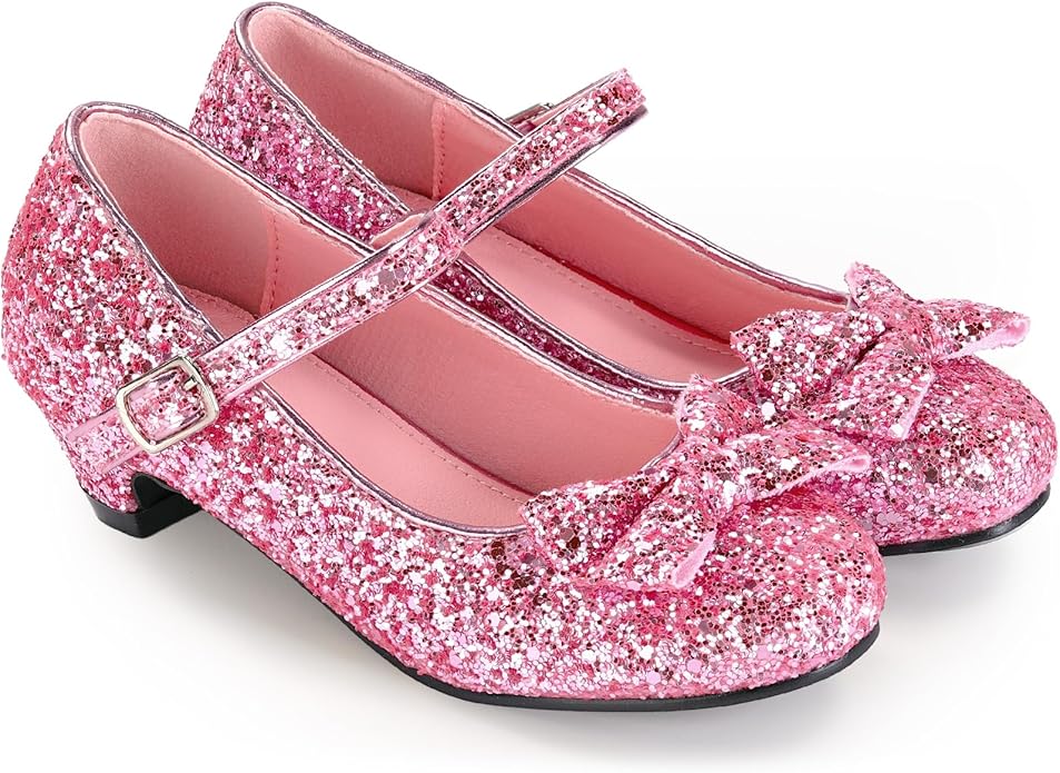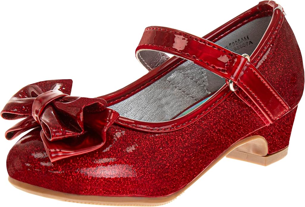 Sparkly Colors Girl Dress Shoes with Bow, Rubber Sole Closed Toe Block Heel Shoes for Toddler to Big Kid, Comfortable Formal and