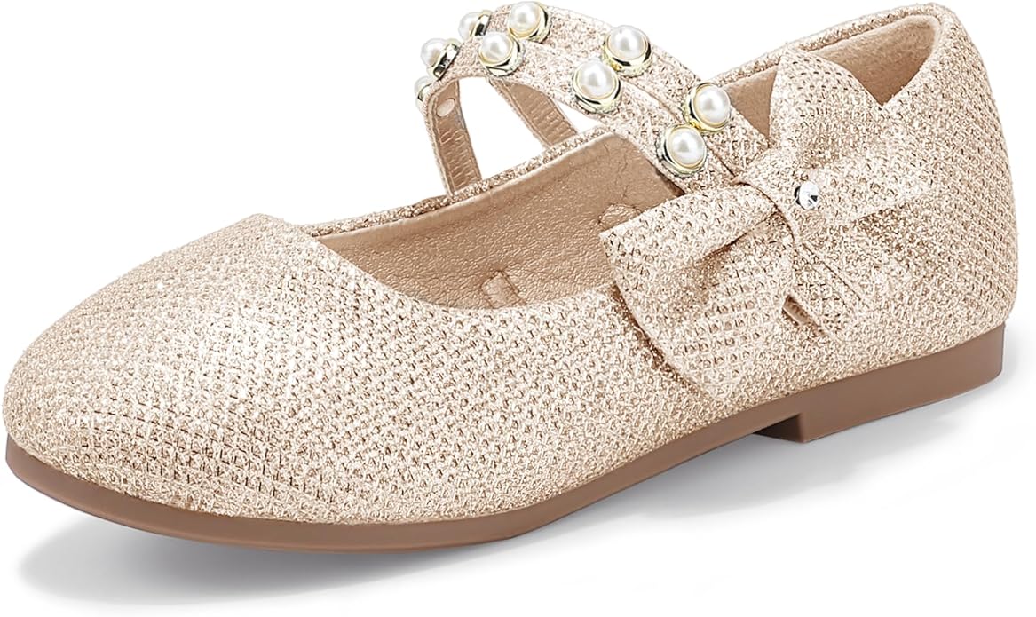 Girls Dress Shoes Flower Girl Flats Pearls Ballet Bow Mary Jane Ankle Strap Wedding Party Shoes for Toddler Little Big Kid