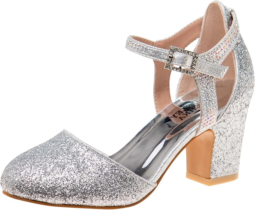 Girls Dress Shoes - Kids' Glitter Rhinestone Dress Pump Block High Heel Sandals with Ankle Strap (Black, Silver, Rose Gold)